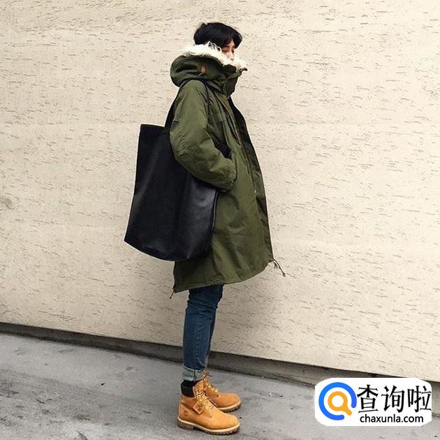 军绿色的大棉服,里面可以穿一件低领的毛衣,下面穿一条深蓝色的牛仔裤,鞋子可以搭配一双颜色比较显眼的皮鞋。