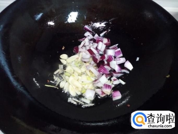 锅里重新放入油加热,油热后放入花椒爆锅,放入葱,姜,蒜,圆葱,翻炒。