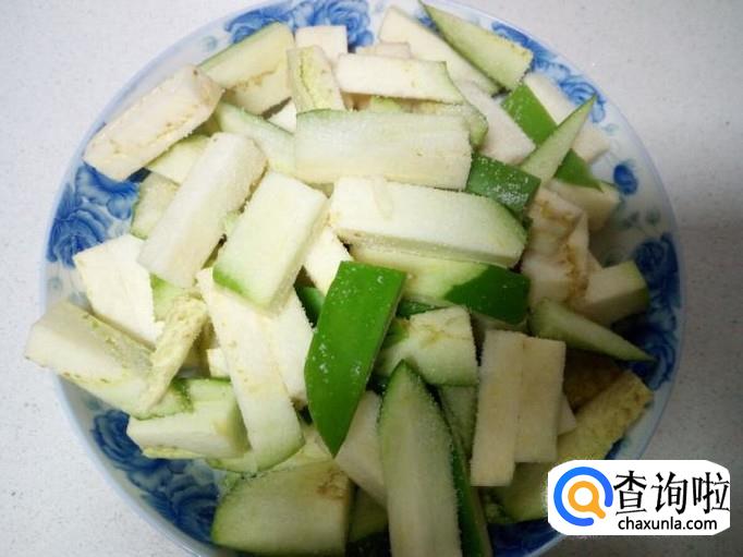 在切好的茄子上面,撒上少许盐,腌制20分钟。然后把腌茄子下来的水倒掉,这样翻炒茄子的时候,茄子不吃油。
