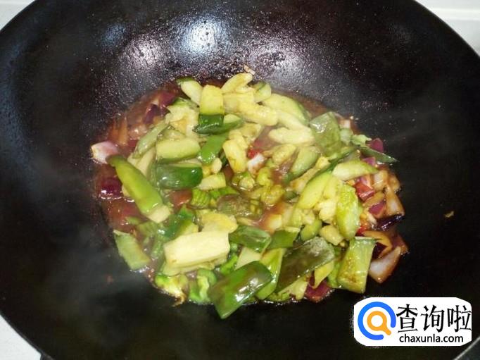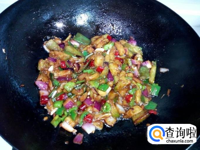放入红干椒,青椒稍翻炒一下,随即放入炒好的茄子翻炒。