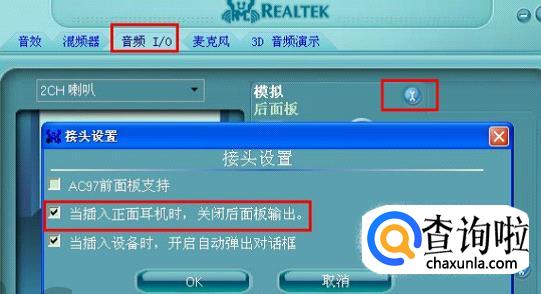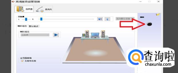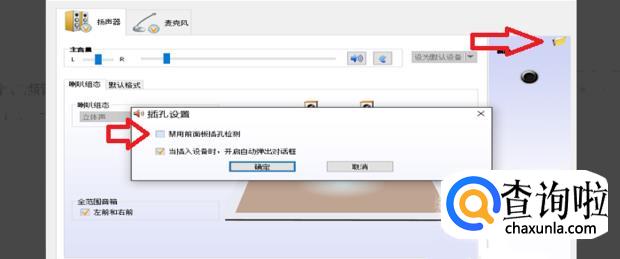 或者点击右上角的文件夹图标,在跳出来的窗口里,把“禁用前面板插孔检测”的勾去掉,点击确定。