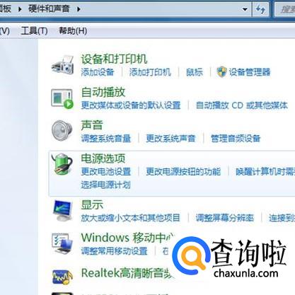 在硬件和声音里选择“电源选项”。