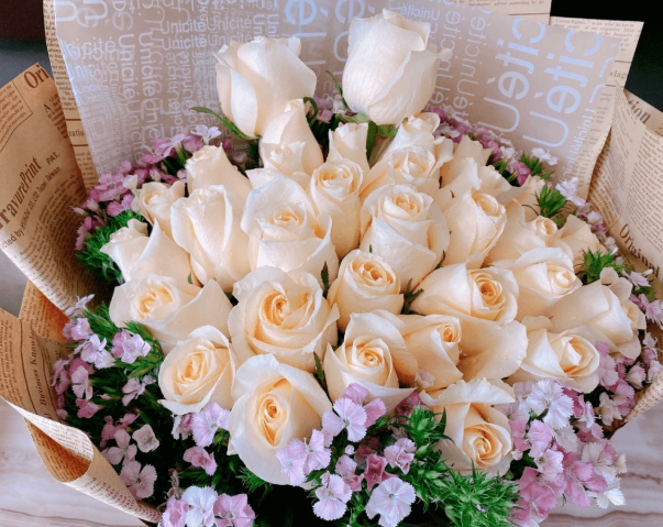 香槟玫瑰的代表花语是:爱上你是我今生最大的幸福,想你是我最甜蜜的痛苦,和你在一起是我的骄傲,没有你的我就像一只迷失了航线的船。送香槟玫瑰的寓意为:我只钟情你一个。这个品种实际上并不是纯白的,看上去是甜蜜的、柔软的奶油色。比起纯白的玫瑰来,多了一份优雅与沉着。