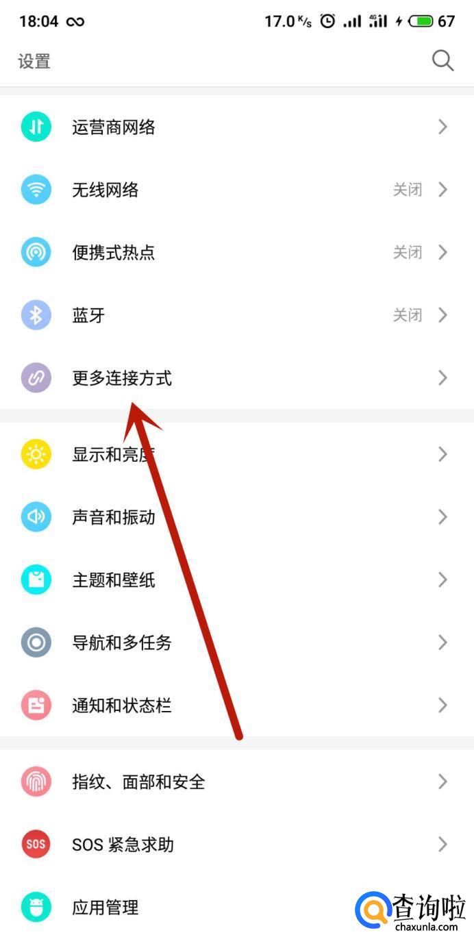 进入手机设置,选择“更多连接方式”,如图所示。