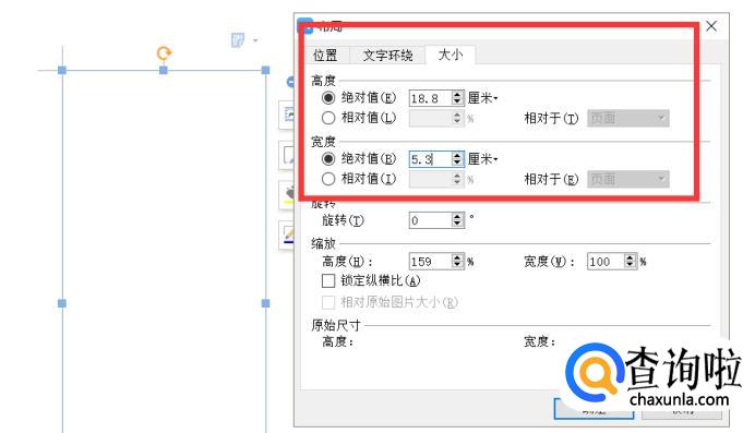 选择“大小”,高18.8厘米,宽5.3厘米。
