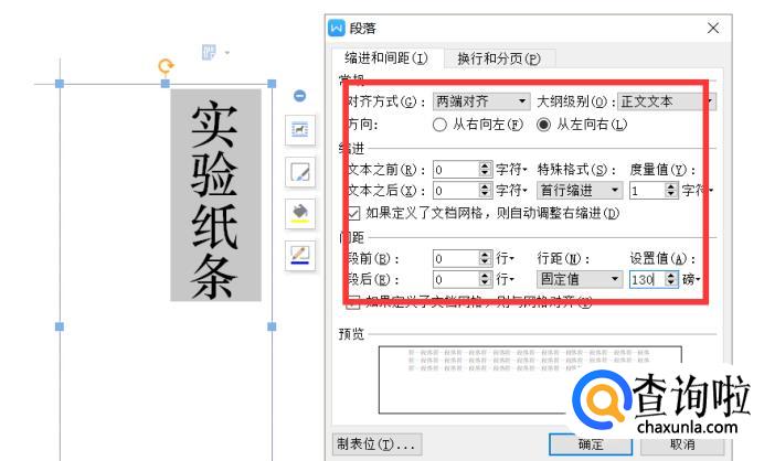 选中文本内容,选择“段落”,两端对齐,首行缩进1字符,固定值130磅。