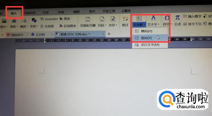 打开word文档,点击工具栏“插入”按钮,选择“文本框”——“竖向”。