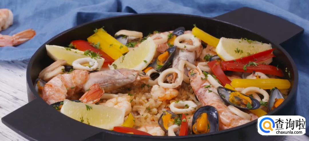 等米饭上面的水分差不多收干后,在米饭上均匀的铺上各类海鲜、虾仁、焯过水的大虾、贻贝、鱿鱼圈,再挤少许柠檬汁。加盖煮至海鲜全熟,就可以关火了。成菜时以柠檬和甜椒点缀,撒少许欧芹碎就完成啦。