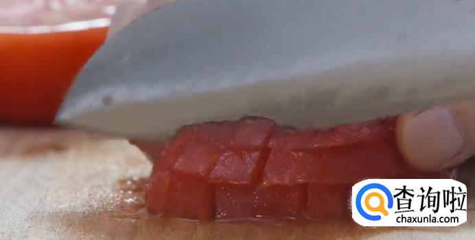 接下来开大火,在平底锅内倒入适量橄榄油,下洋葱和蒜片煸香,接着加甜椒粒和番茄粒,炒到出汁。