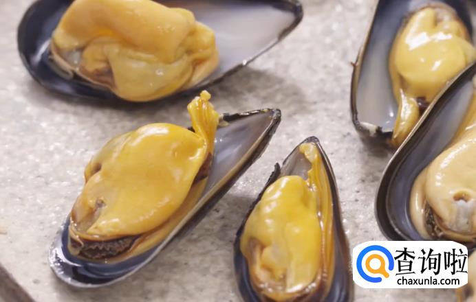 洗净的贻贝入沸水汆烫至开口,掰去半边外壳。