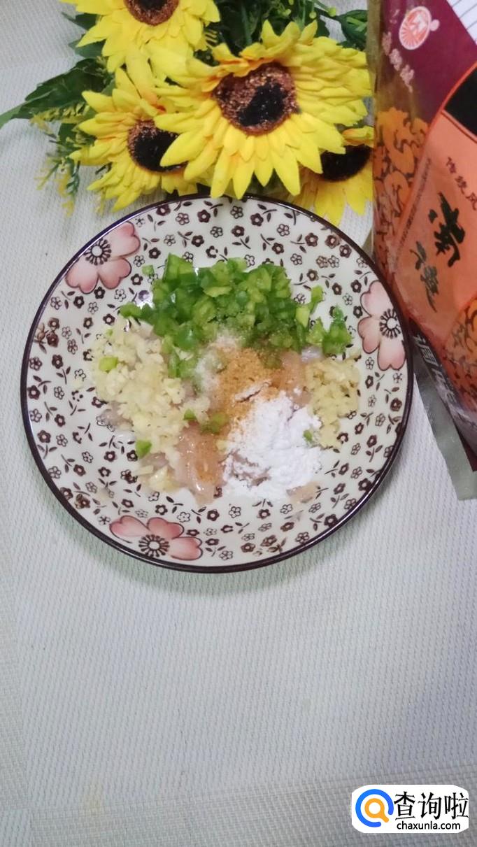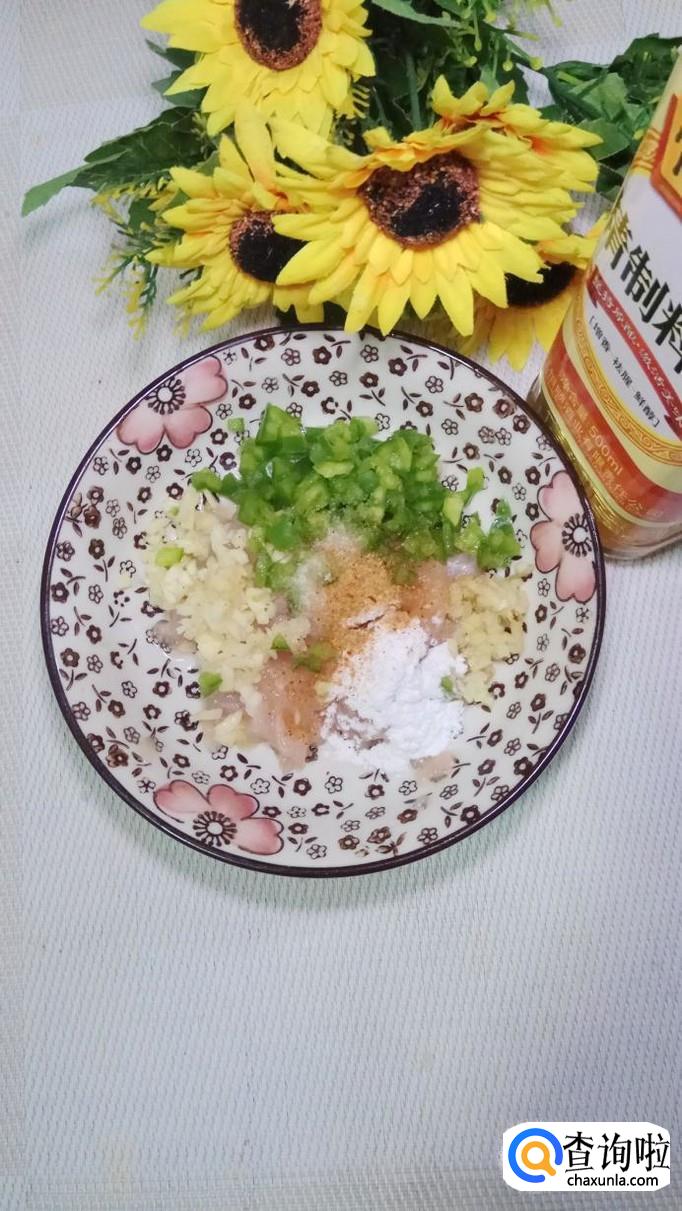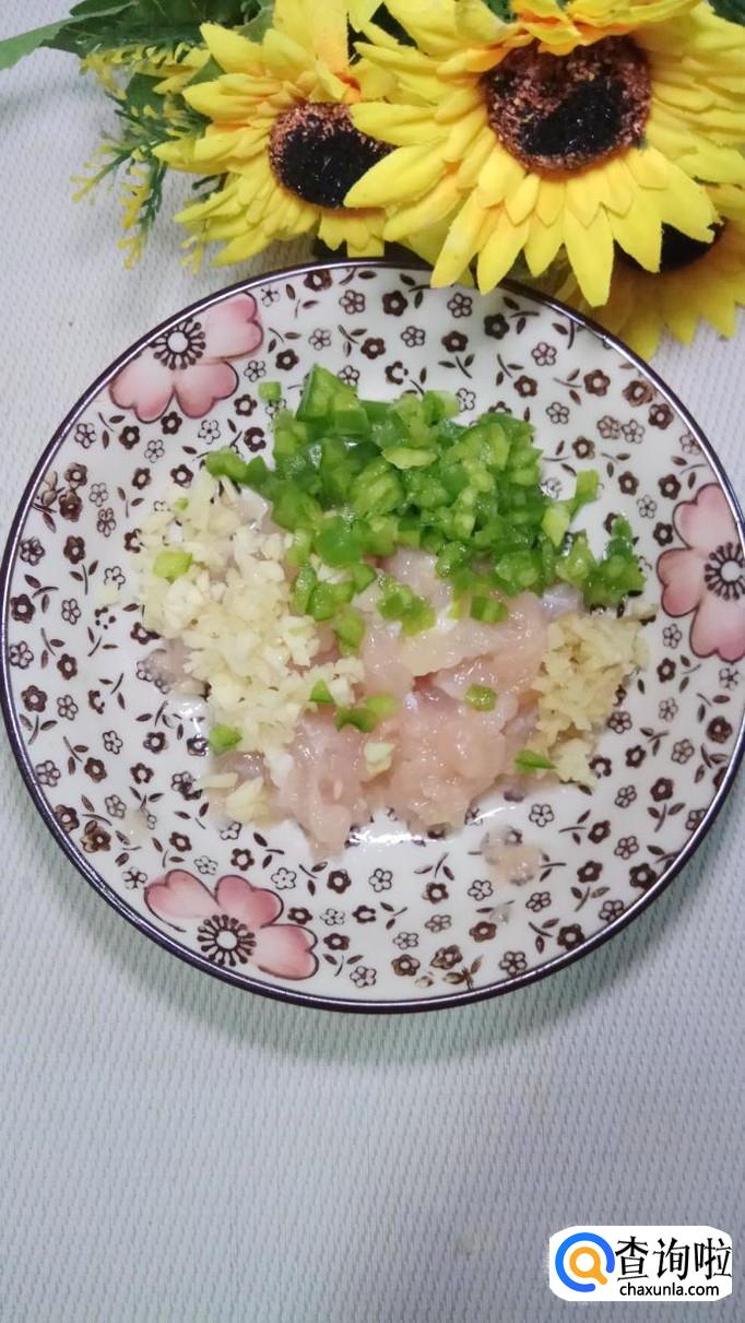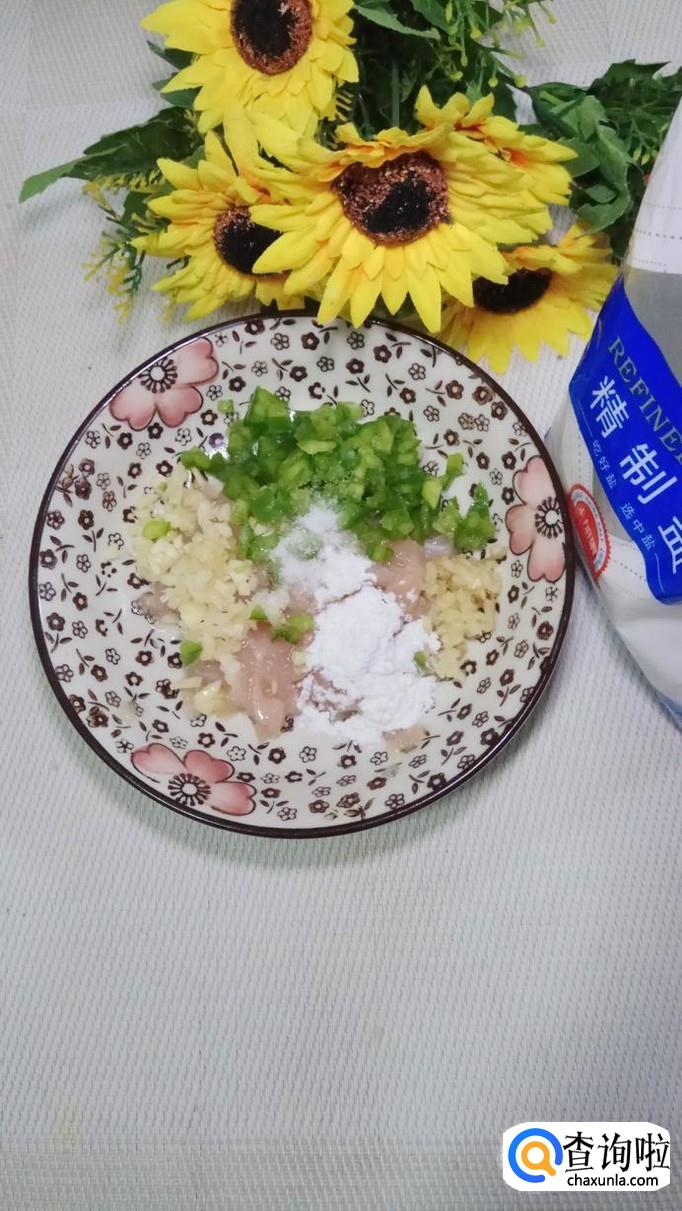 将鸡胸肉洗净后切碎,放入盘中备用,再准备适量姜,蒜切碎,少许青椒切成小粒儿,将它们和鸡胸肉放在一起。