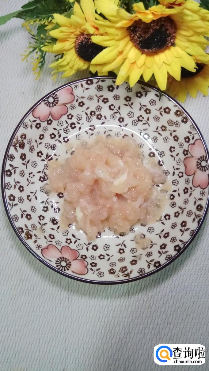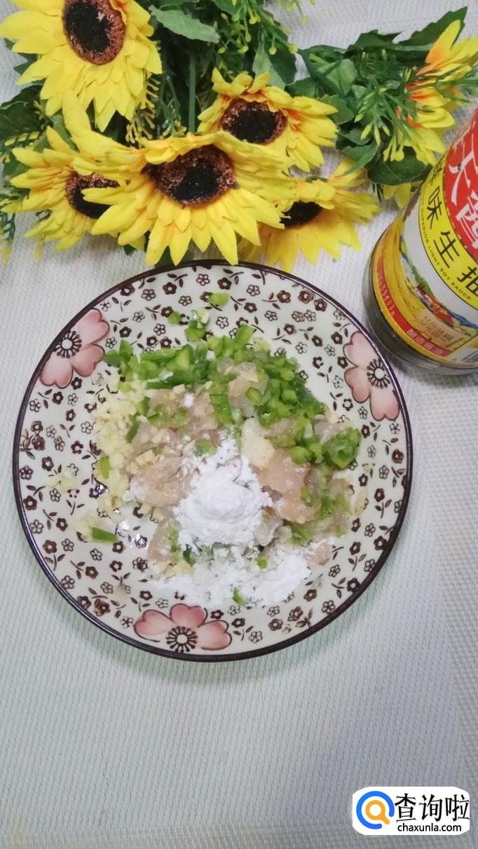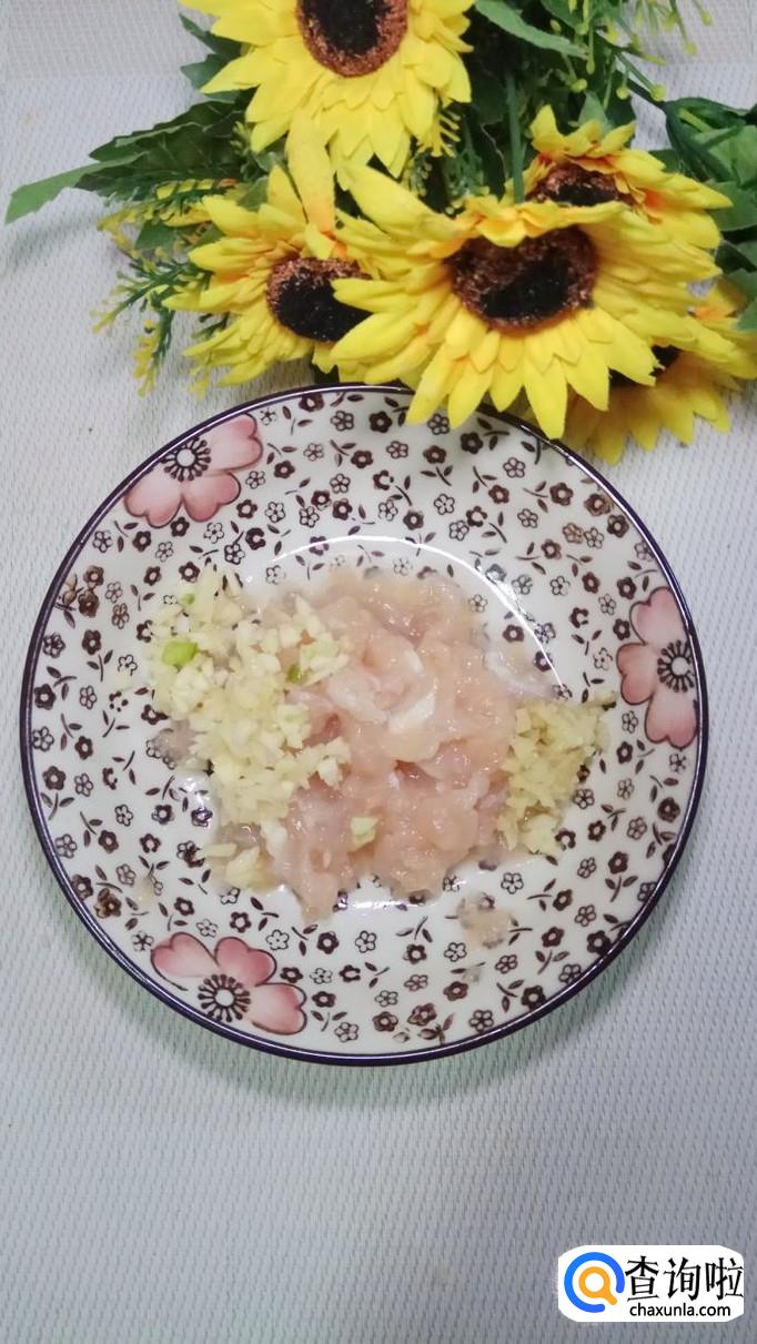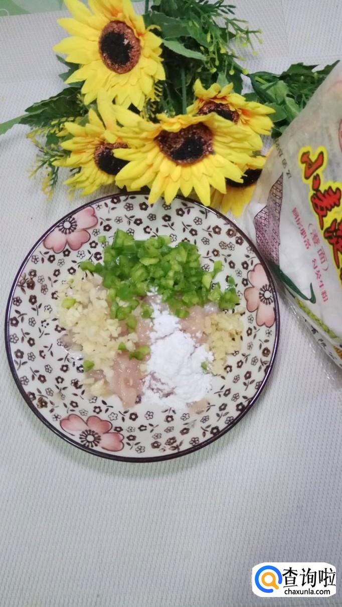 将鸡胸肉洗净后切碎,放入盘中备用,再准备适量姜,蒜切碎,少许青椒切成小粒儿,将它们和鸡胸肉放在一起。