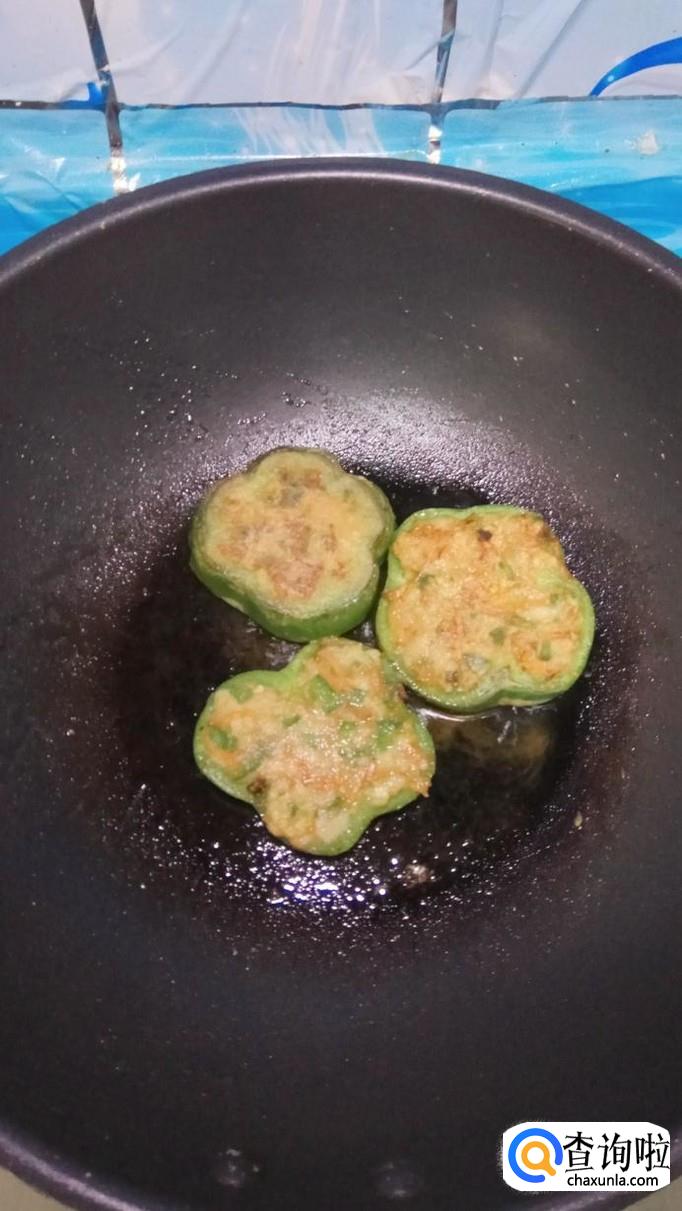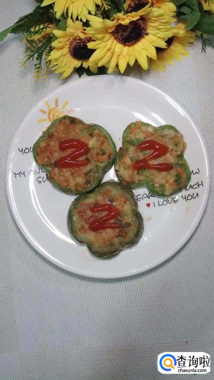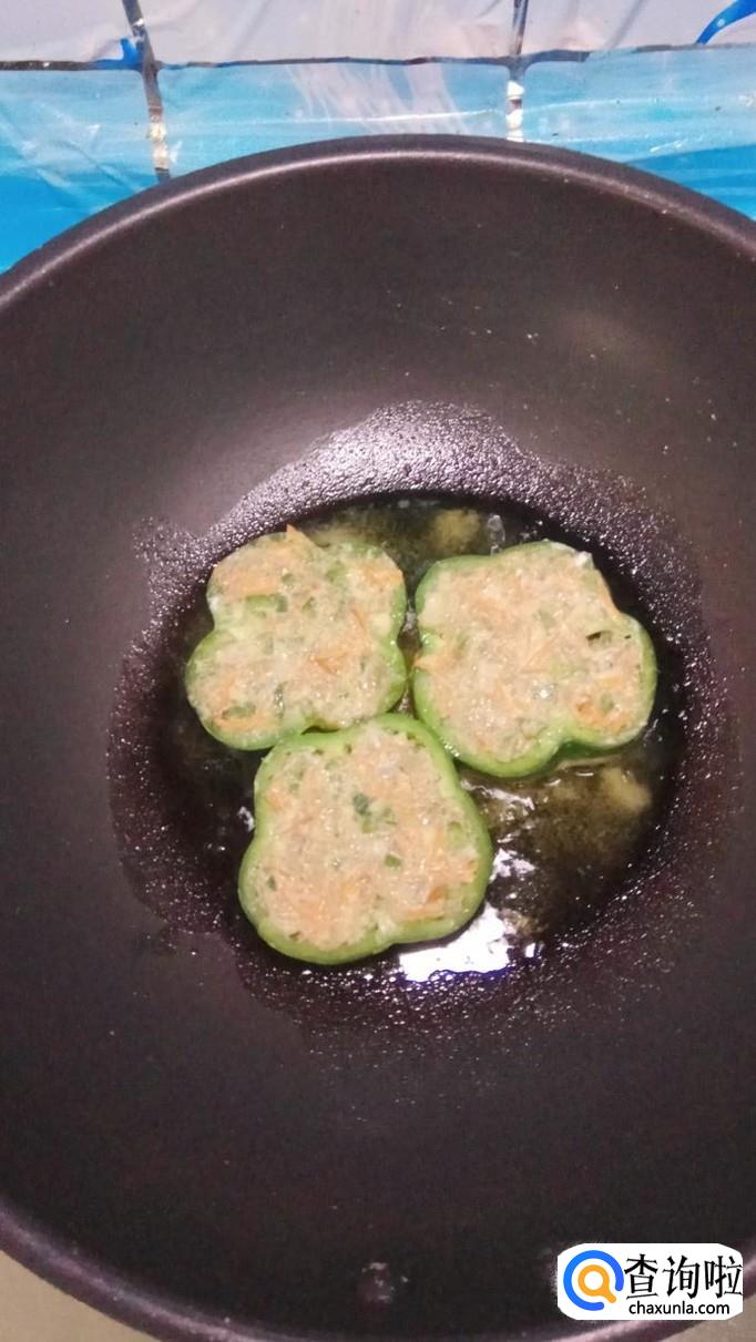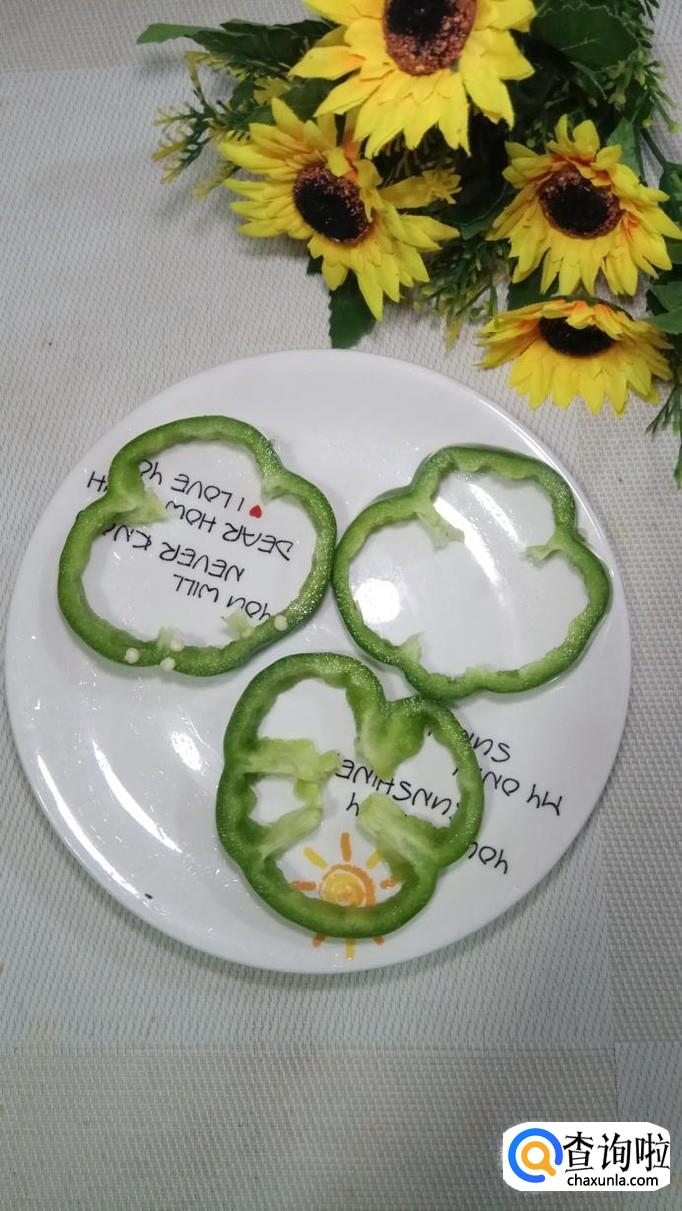 将青椒切成几个圈,放入盘中,然后将腌好的胡萝卜鸡胸肉放入青椒圈,平底锅放入适量油,油热后,将青椒圈放入锅中,小火慢煎。
