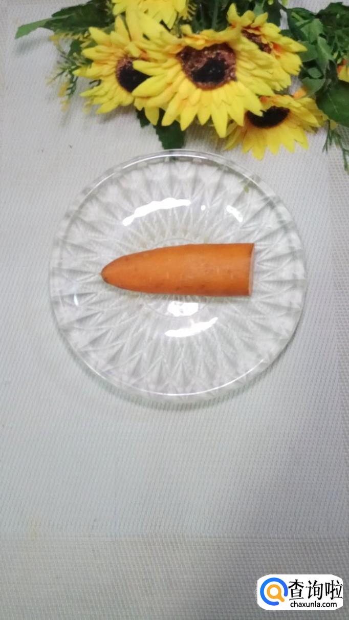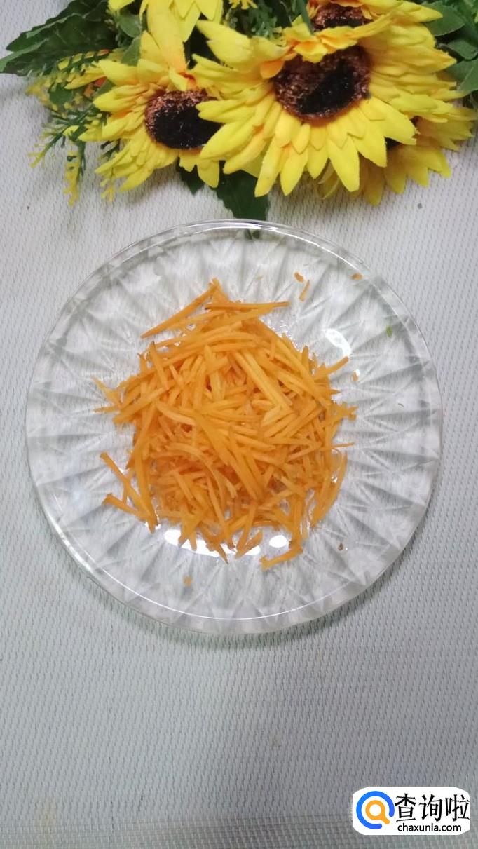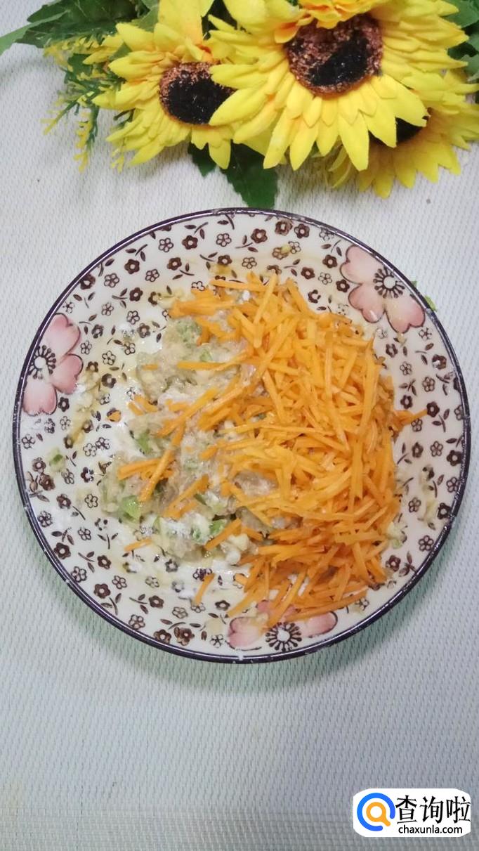 将胡萝卜洗净后,切碎放入盘中,和鸡胸肉放在一起,搅拌均匀,腌制15分钟左右。