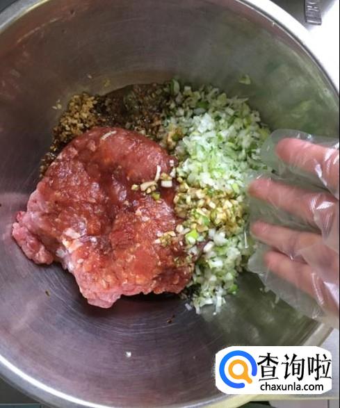 肉馅里加入油,适量盐,味极鲜,搅拌均匀。