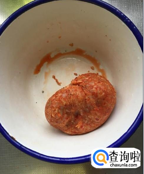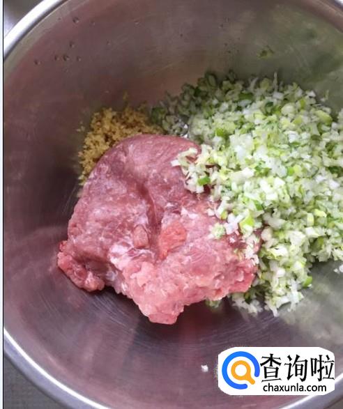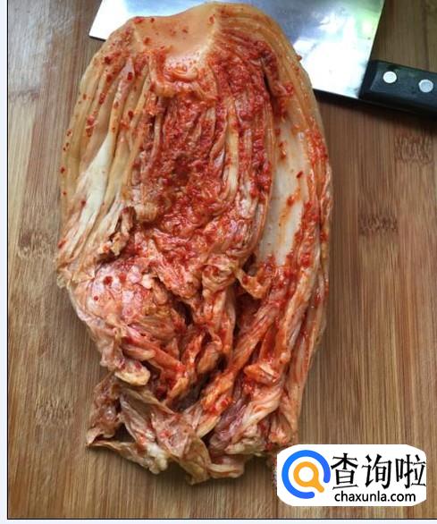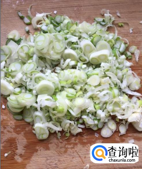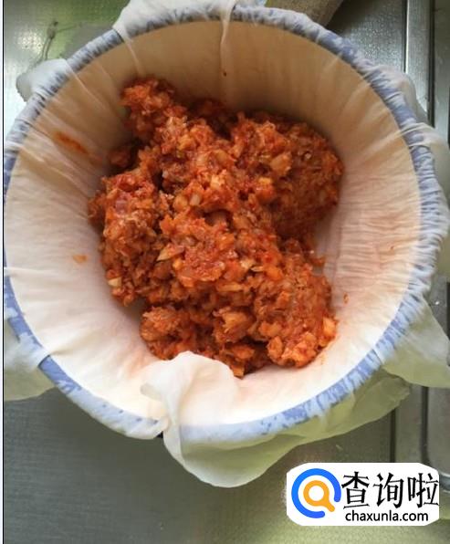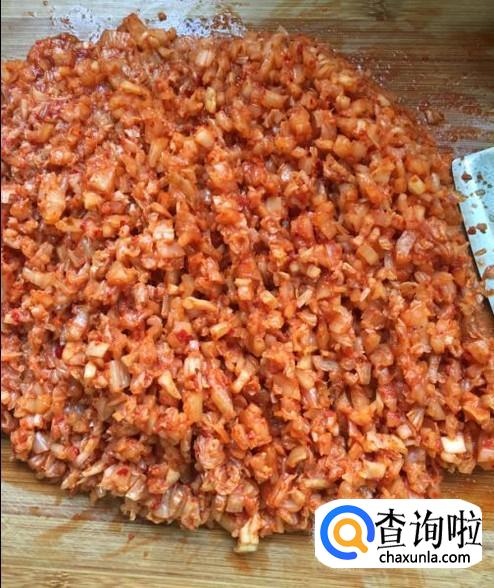 辣白菜适量,切碎,用纱布挤一下水,放在盆里备用。