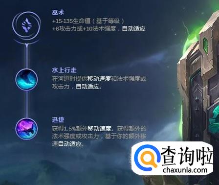 副系上点出巫术,主要是因为机器人其实是一个先手开团的英雄,所以抓时机就很重要,巫术中能够提供的是移动速度,所以迅捷还有水上行走就非常重要了。