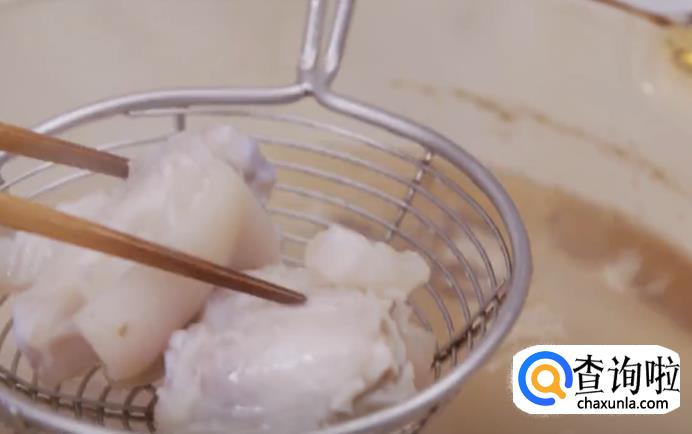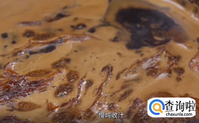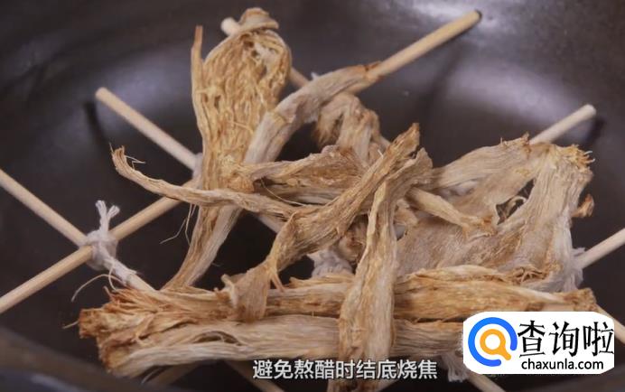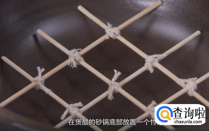 开大火把姜醋汁煮沸,然后转小火慢炖收汁,直至姜醋汁变得粘稠,能挂在勺子上为佳。煮好之后,取出竹架和生姜,把锅里的浮沫撇去。