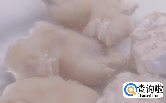 接下来,给斩件的猪脚焯水。冷水下锅后开火煮,直至完全沸腾后捞出。捞出之后,再移到冷水中洗净。
