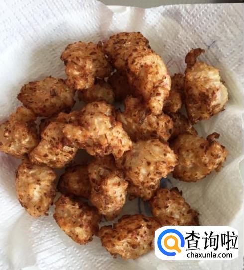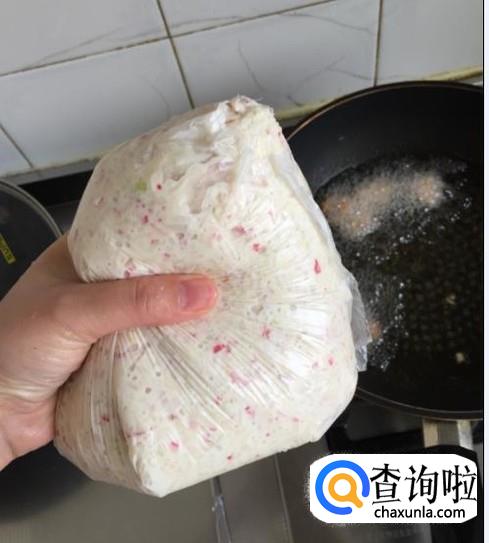 将馅料从口里挤出,用勺子舀成一个个的,放进热油里。