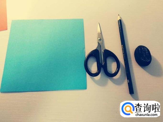 首先,我们准备好剪纸所需要用到的工具和材料:蓝色的方形彩纸一张,剪刀一把,铅笔一支,橡皮擦一个