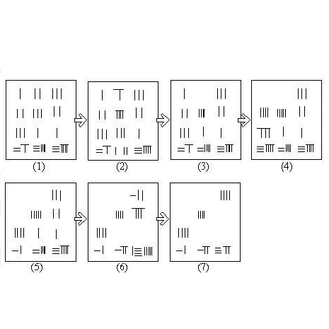 天元术是利用未知数列方程的一般方法,与现代代数学中列方程的方法基本一致,但写法不同。它首先要“立天元一为某某”,相当于“设x 为某某”,再根据问题给出的条件列出两个相等的代数式。然后,通过类似合并同类项的过程,得出一个一端为零的方程。天元术的表示方法不完全一致,按照李冶的记法,方程a0xn+a1xn-1.+an-1x+an=0可写成如下形式:其中a0,a1,.,an 表示方程各项系数,均为筹算数码,在常数项旁边记一“太”字(或在一次项旁边记一“元”字),“太”或“元”向上每层减少一次幂,向下每层增加一次幂。方程列出后,再按增乘开方法求正实根。