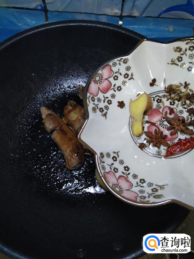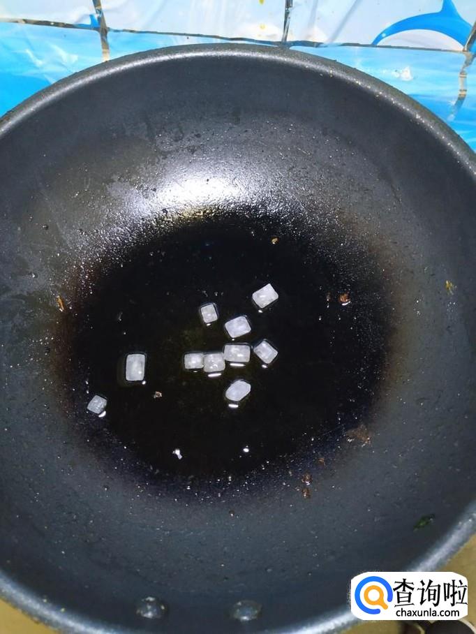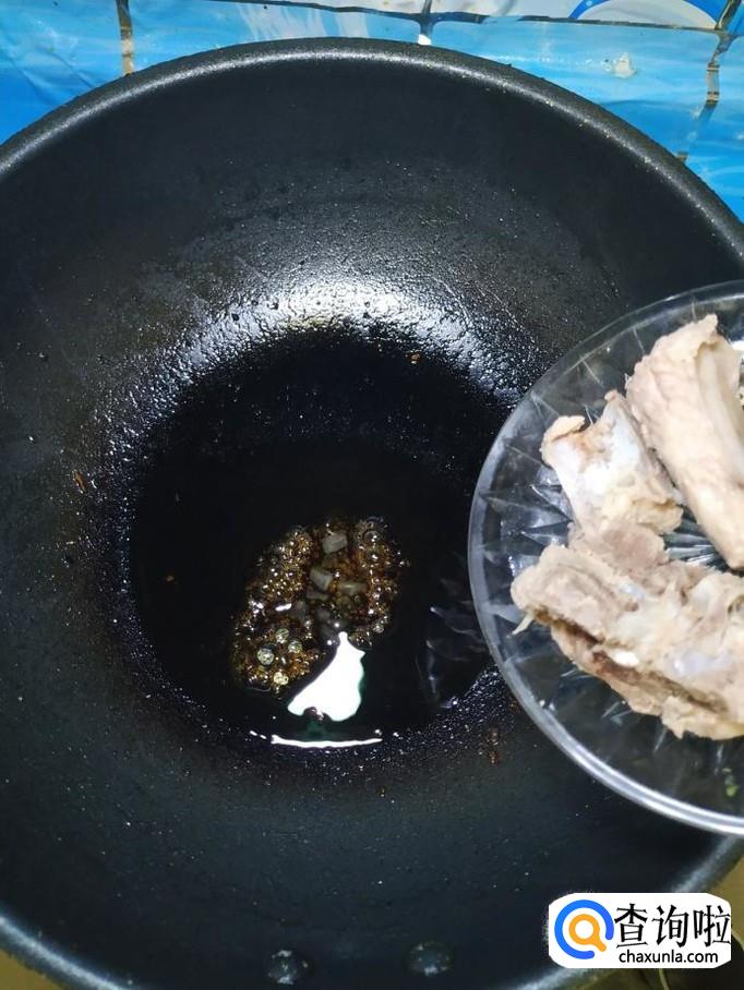 炒锅中放入适量油,油热后,放入适量冰糖,慢慢的将冰糖熬出糖色,然后将排骨倒入锅中,翻炒均匀。