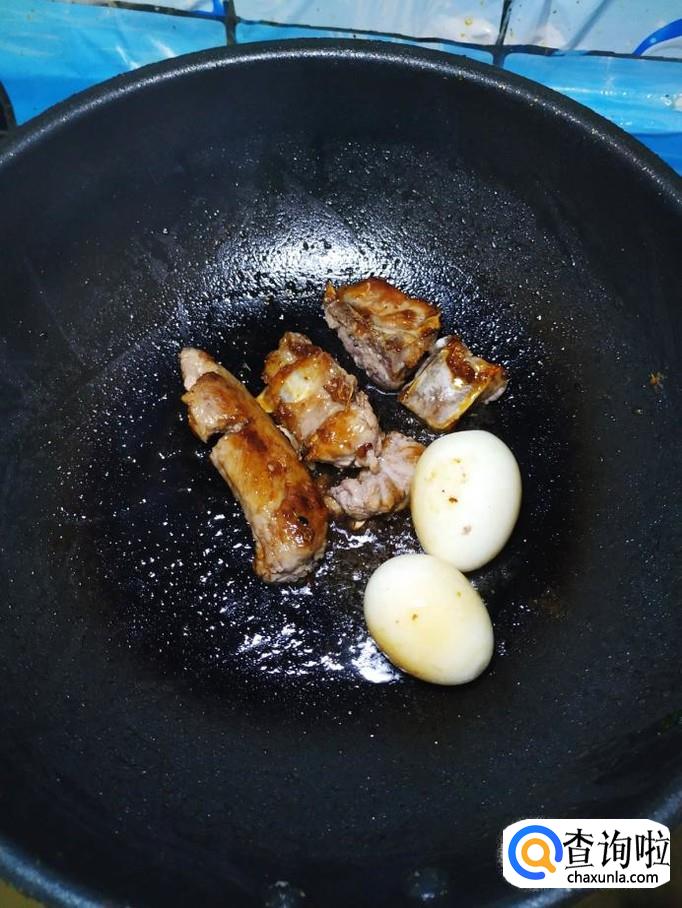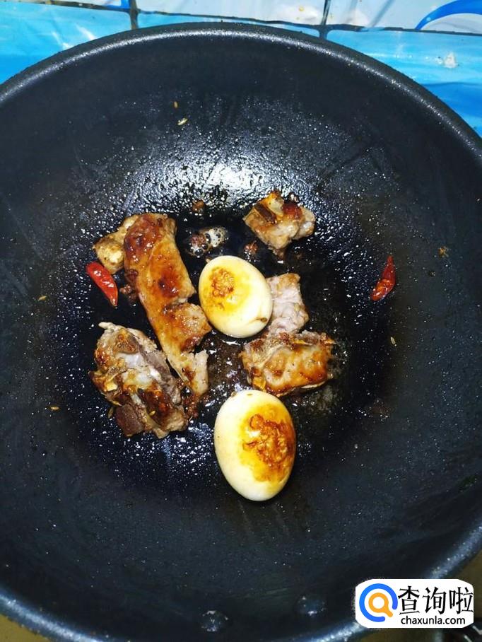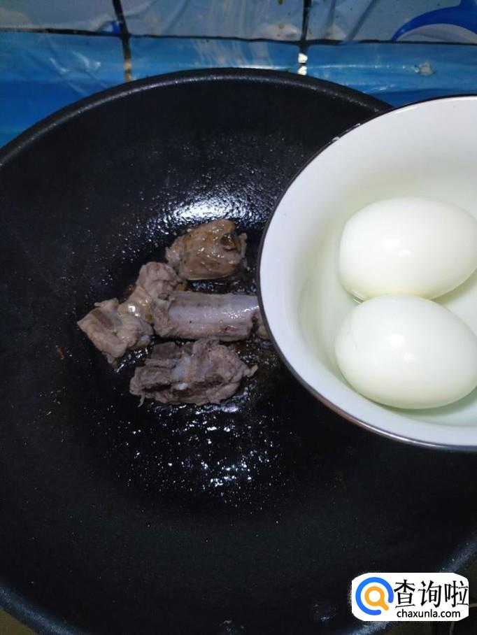 将剥好皮的鸡蛋倒入锅中,和排骨一起翻炒均匀。