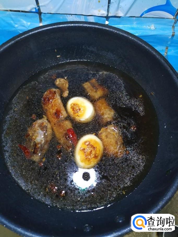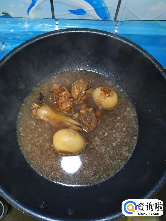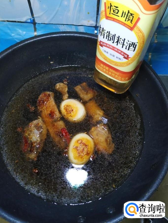 加入适量清水,清水的量,一定要没过排骨和鸡蛋,然后加入适量料酒去腥。