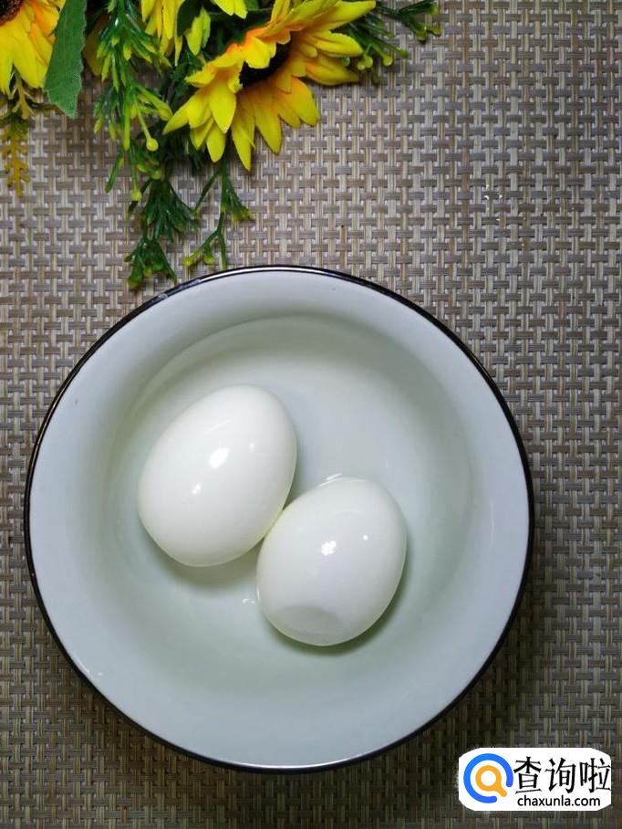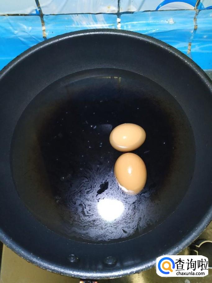 再准备两个鸡蛋,放入锅中,煮5分钟左右,煮熟之后,捞出,放入凉水中,然后剥去外皮备用。