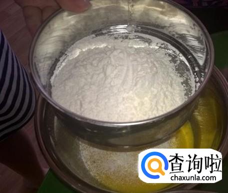 在蛋黄里面加入牛奶和色拉油,再用筛子把我们的低筋面粉倒入搅拌均匀的蛋黄中去,然后搅拌均匀,这个时候不要画圈搅拌,不然我们的面粉容易结团。
