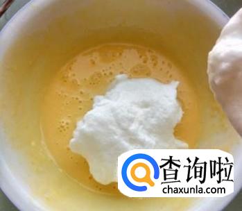 把打发的蛋白放入我们的蛋黄中搅拌均匀,可以分几次放入。