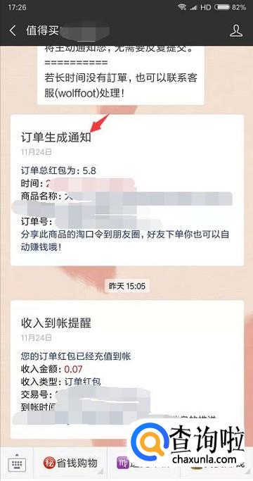 最后我们的订单就会自动生成,里面的红包金额就是订单的返利。