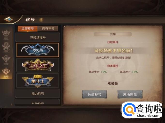 游戏中玩家可以从竞技场中获得称号,之后给角色佩戴称号后可以提升角色的战力。