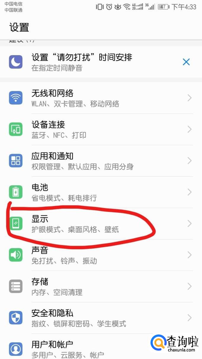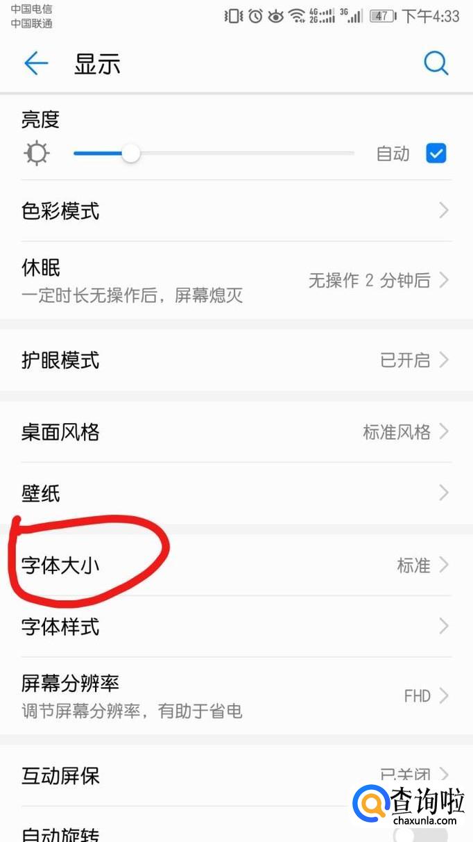 点击“显示”进去显示界面,找到“字体大小”,进入后,可拖动底部调节至满意程度。