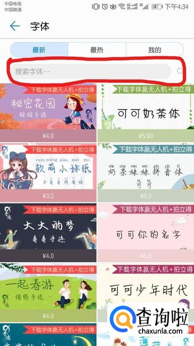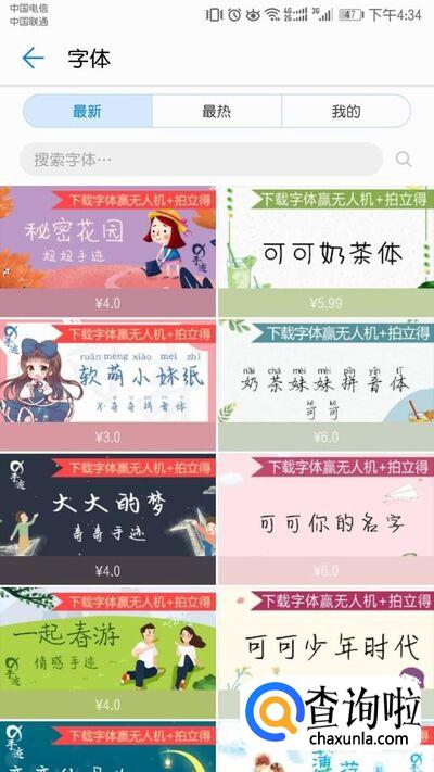 在字体样式里,可见大部分都是需要付费的,如果你不想付费,可以在搜索栏中搜索“免费”,然后选择自己喜欢的字样。下载好的字体在“我的”里面可随意切换。