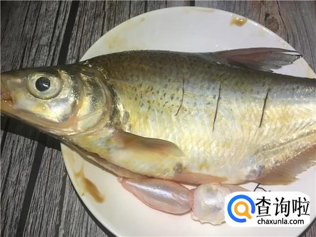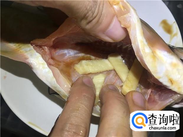 用刀子刮掉鱼鳞,去掉鱼鳃和鱼内脏,清洗干净。然后往鱼肚子里塞少许姜片,加入少许蚝油、酱油、盐、料酒,抹均匀鱼的全身,腌制一会。