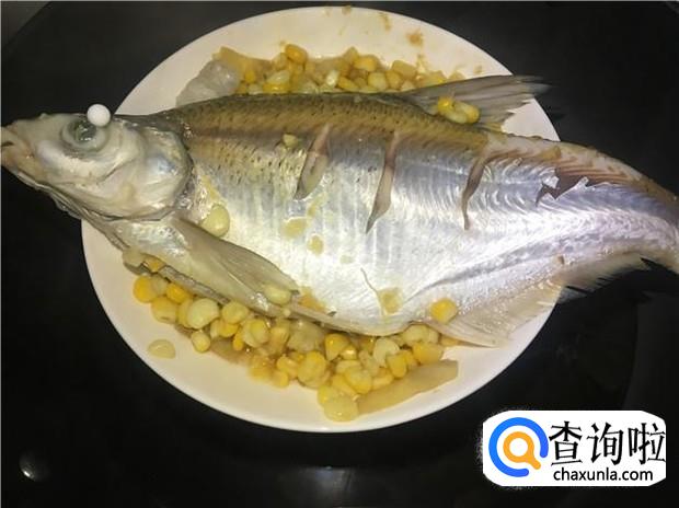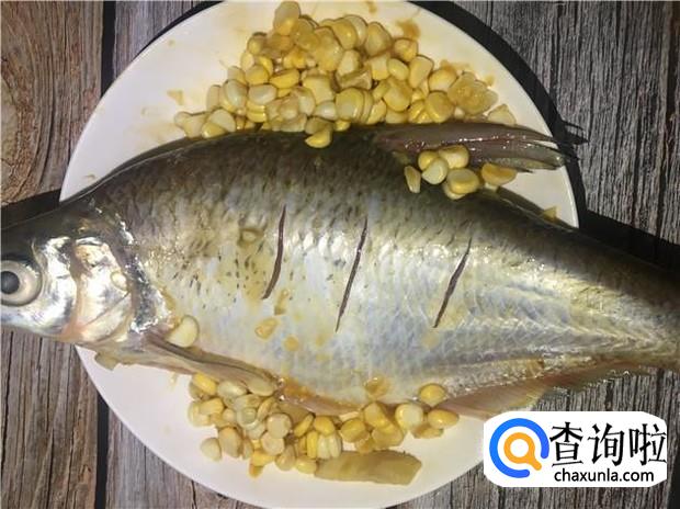 把搅拌均匀的玉米均匀洒在鱼的两边,鱼本身已经腌过的,所以不需要另外加盐。