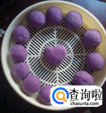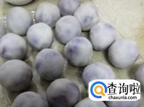 蒸好的糊糊放凉后取出,将糊糊取出揉成一个个小球,然后将小球擀成扁平状,中间薄,四周厚,然后将紫薯球放进去,包裹住,重复包完。
