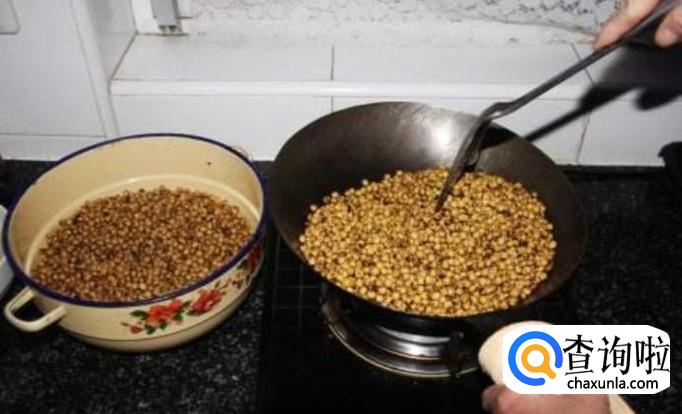 接下来把控干水分的黄豆放入大锅里面干炒,等豆子颜色变深慢慢炒出味道后就可以拿出来了。