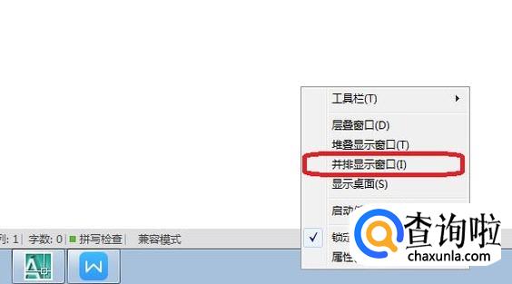 如图所示,右键单击任务栏,弹出菜单,我们点击“并排显示窗口”。