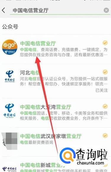 进入之后,选择“公众号”搜索“中国电信营业厅”,如图所示。