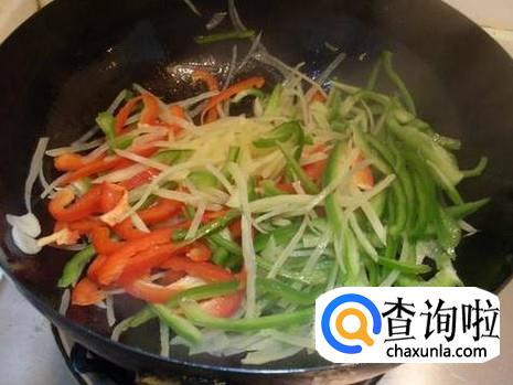 再将青、红椒丝放入锅中,加入适量的盐和醋,用铲子翻炒均匀,当土豆丝炒熟后,就可以出锅了。这道菜因为土豆丝经过清水泡,里面的淀粉减少了,炒出来的土豆丝口感特别好,而且加入了青红椒丝,增加了辣椒的味道,清爽好吃。