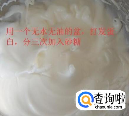 然后用一个无水无油的盆,打发蛋白,分三次加入砂糖,如下图所示