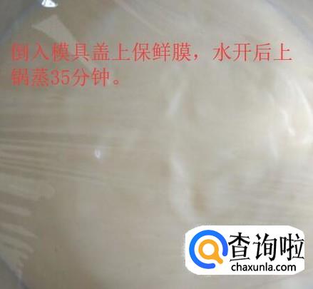 然后,倒入模具盖上保鲜膜,水开后上锅蒸35分钟。如下图所示