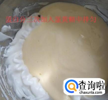 接着把蛋白分三次加入蛋黄糊中拌匀,如下图所示