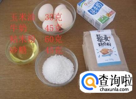 首先准备好所有的食材,如下图所示:玉米油33克,牛奶45克,粘米粉60克,砂糖45克。