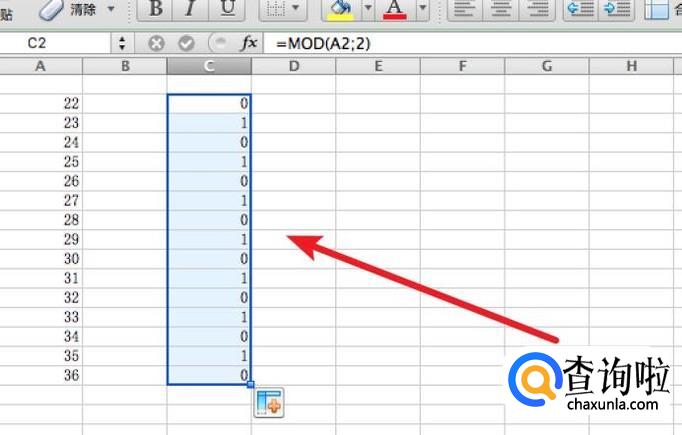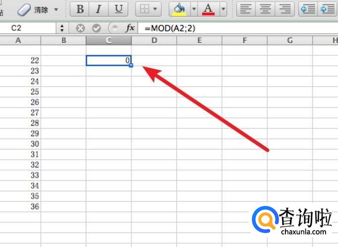 打开excel,看到A列有一些数据,假设我们要求这些数据除2的余数。