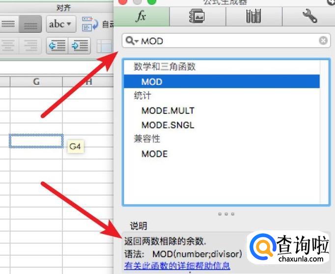 在函数窗口,输入mod,就可以搜索到这个函数了,并可以看到这个函数的使用说明。