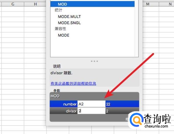 双击这个函数,在下方的窗口里输入参数,第一个输入A2,第二个输入2,表示的就是求A2数据除2的余数。
